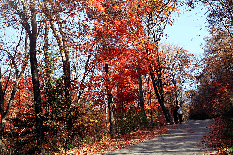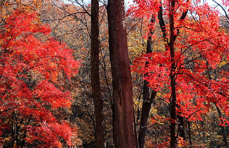 秋天真真切切地来临了,从聆听到第一枚秋叶零落时…… 当春风抚绿那一抹新绿叶时,就注定了一场秋的别离。有离去,才有不舍,才有别殇,才有万般的无奈与彷徨。而今,落叶终将离去,满载着尘世的浮华与沧桑。 暂时远离喧闹的人群,径自踏上一条幽静的小路。漫无目的地走着,越过一枚枚落叶,因为不忍心踩坏她,也担心惊扰了她的一袭好梦。有叶依然在飘落,静静地聆听到落叶的心跳,然后与她互诉衷肠。淡淡的忧伤,隐隐的惆怅。即使她不语,但是我想,她懂。 红石林区的秋终是要离去,为了孕育更伟大的重逢。四季轮回,岁月更迭,坦然,淡然,悠然…… 撷一枚枫叶,印在秋冬交汇的言语里。