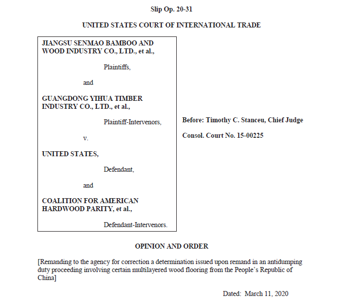 经诉讼中多轮交锋,国际贸易法院于2018年6月8日将案件第一次发回美国商务部重审,法院对江苏森茂的两大诉求均予以支持,第一,要求美国商务部纠正其针对江苏森茂的胶合板、胶水以及内陆运费等项目的错误替代价格的问题;第二,要求美国商务部纠正其针对江苏森茂出口价格中错误减扣增值税与出口退税差的问题。