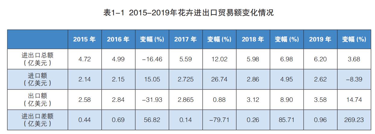 进出口贸易总额6.20亿美元,较2018年增加0.22亿美元,增幅3.68%。其中,花卉进口额2.62亿美元,同比减少0.24亿美元,降幅8.39%;花卉出口额3.58亿美元,同比增加0.46亿美元,增幅14.74%,较2018年的8.90%增加5.84个百分点。