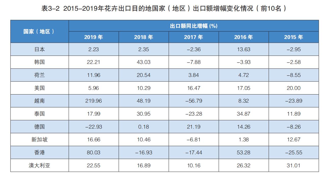 2019年,我国花卉出口目的地国家(地区)有97个。花卉出口额排名前5位的国家分别是日本、韩国、荷兰、美国和越南,出口额占比65.02%;排名前10位的国家(地区)出口额占比82.21%,同比增幅为15.45%,其中,除对德国出口下降22.93%外,其余9个国家(地区)的出口额同比均呈上升趋势。