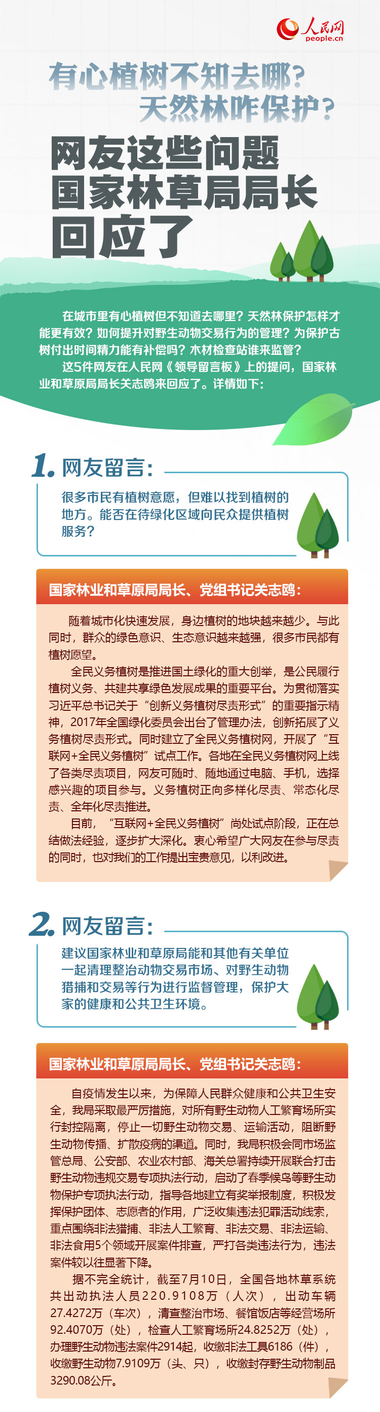 近日,国家林业和草原局局长关志鸥集中对人民网《领导留言板》上的5件网友留言作出回应,涉及网友关心的创新义务植树尽责形式、野生动物交易监管、古树名木保护等多方面问题。