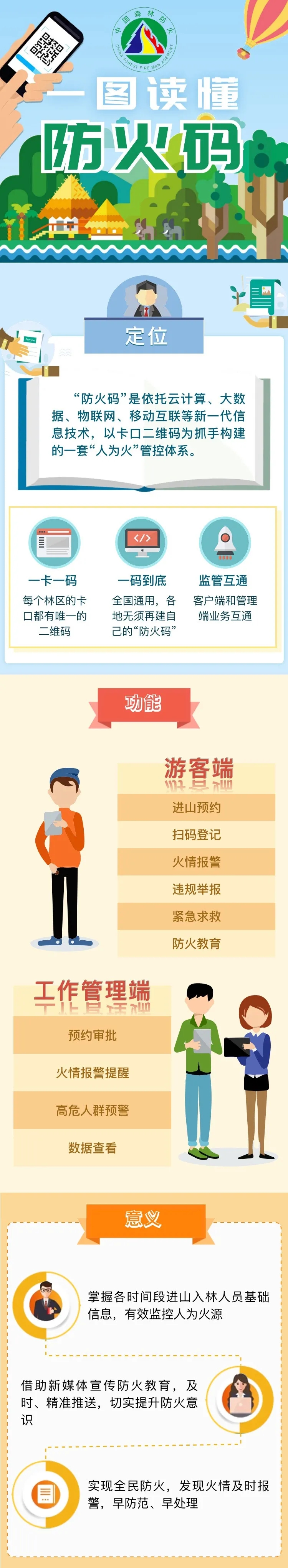 “防火码”是依托云计算、大数据、物联网、移动互联等新一代信息技术,以卡口二维码为抓手构建的一套“人为火”管控体系。可以帮助进山人员快速扫码登记,主动学习防火知识,切实提升防火安全意识;支持森林防火管理人员建立进山入林人员大数据,有效防控人为火源,科学开展火情原因分析及事后追责工作。