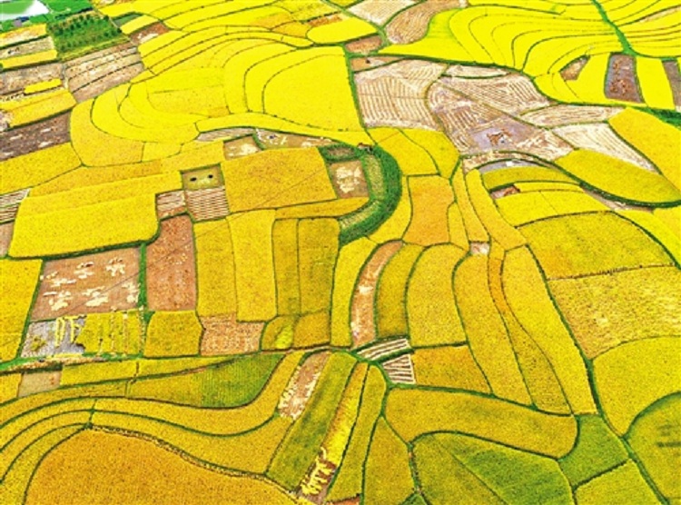 近日,贵州省黔西南布依族苗族自治州安龙县海庄村迎来稻谷收获季节(无人机照片)。刘朝富摄(中经视觉)