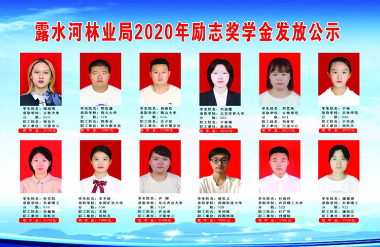 金秋十月,露水河林业局2020年“励志奖学金”发放工作圆满收官,为该局21名品学兼优的职工子女发放励志奖学金7.8万元,帮助高考学子共圆大学梦。