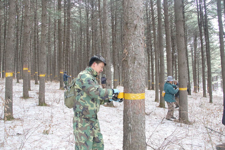 落叶松毛虫是本土重大林业有害生物,具有适应性强、繁殖快、周期性爆发等特点,对松林具有极大危害性。根据2019年越冬虫情调查结果,预测今年仍有部分区域发生虫情。为有效防控松毛虫对松林造成危害,临江林业局组织相关部门和林场负责人召开专题会议,要求全局迅速行动起来,把具体调查监测工作安排好、落实好,全面做好松毛虫虫情防控工作。 临江林业局闹枝林场和贾家营林场受地理位置因素影响是气温回升最快的林场。清时节期间,林场领导就组织人员,在森防检疫站技术人员的指导下,对不同林分、不同区域,采取阻隔法多点多面设置监测标准地,在树干胸高处缠胶带环,对越冬代松毛虫虫口密度进行监测,以准确地掌握其发生区域、发生面积和发生程度。同时,工作人员还对重点阳坡区域进行了每木缠环,有效遏制了松毛虫上树危害。 |