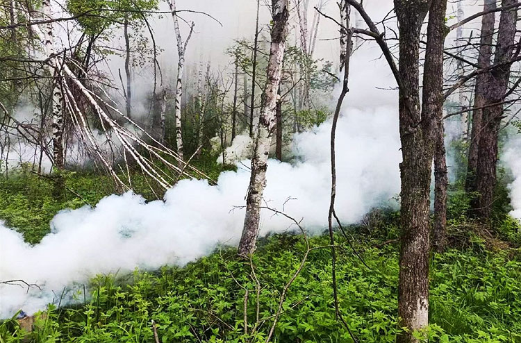 防治作业中,为最大限度提高防治效果,各林场防治人员在早晚大气出现逆温层时段,采用1.2%苦参烟碱烟雾剂开展防治作业。该烟剂对害虫具有强烈的触杀、胃毒和一定的熏蒸作用,具有低毒、低残留、无污染、残效期长、对害虫不易产生抗药性等特点。截止目前,共出动车辆27台次、人员310人次,施放杀虫烟剂10.4吨,防治面积1043.63公顷,圆满地完成2023年松毛虫防治任务。 |